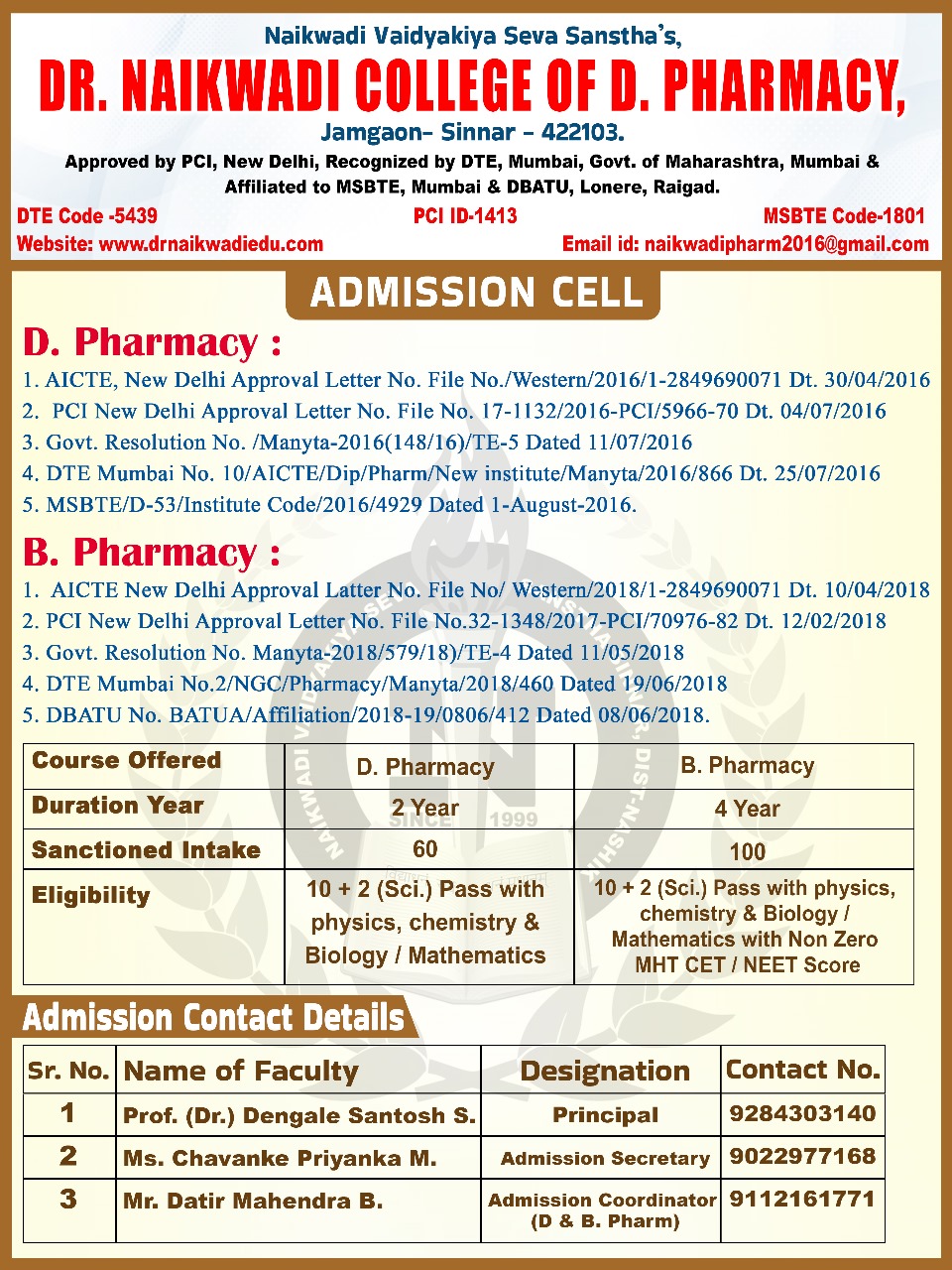 | 1 | D. Pharm | 2 Years | 60 | 12 th Science Passed |